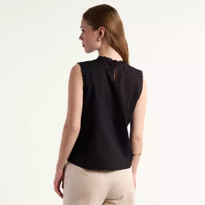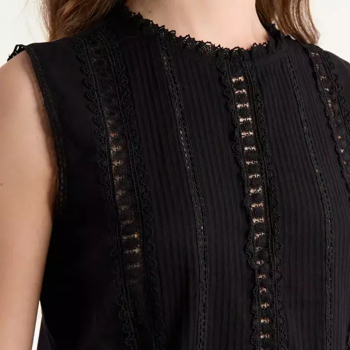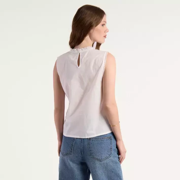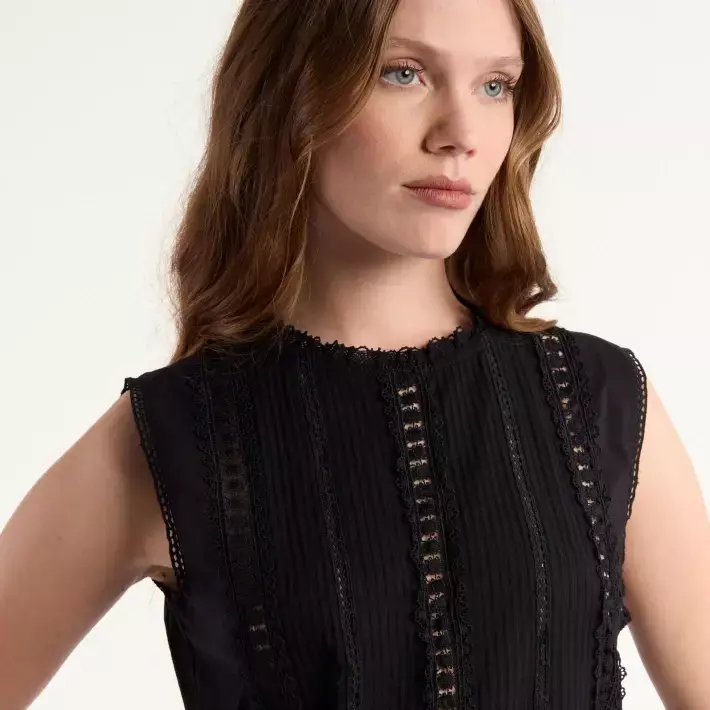 Blusa de escote redondo confeccionada en algodón, posee tela diferencial con borderie calado en delantero.