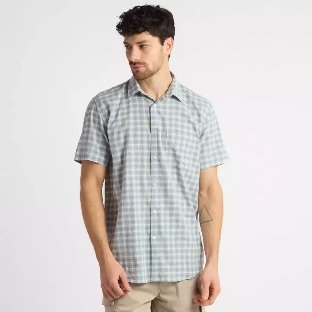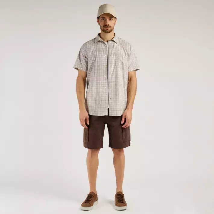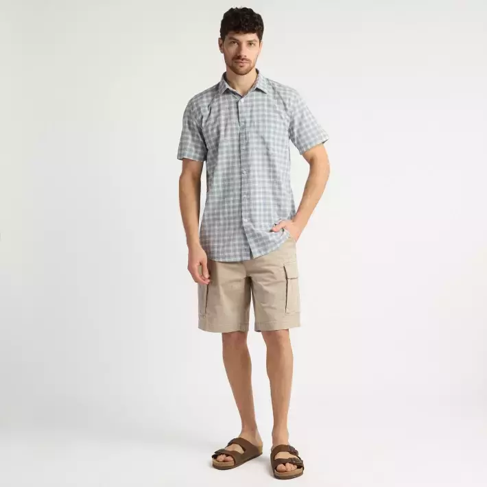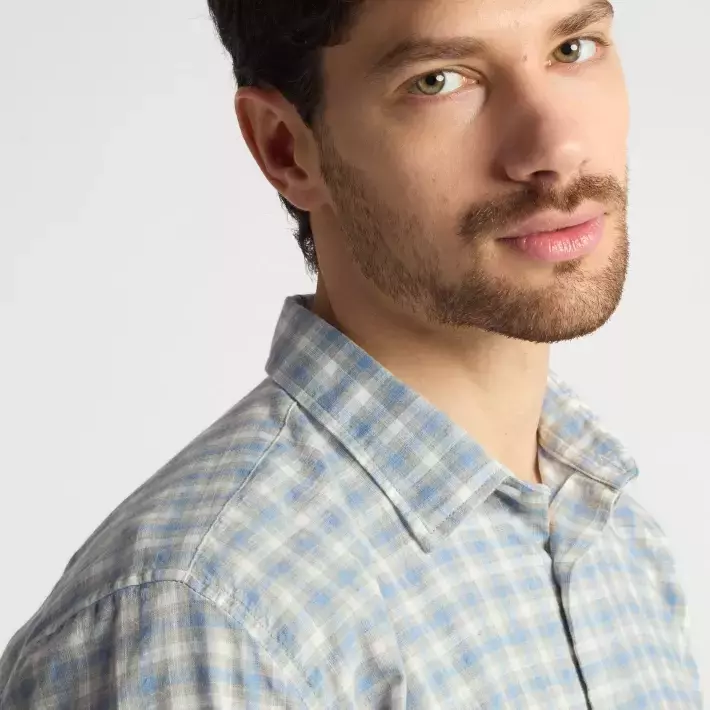 Camisa manga corta confeccionada en tela escocesa, posee un bolsillo en el pecho.