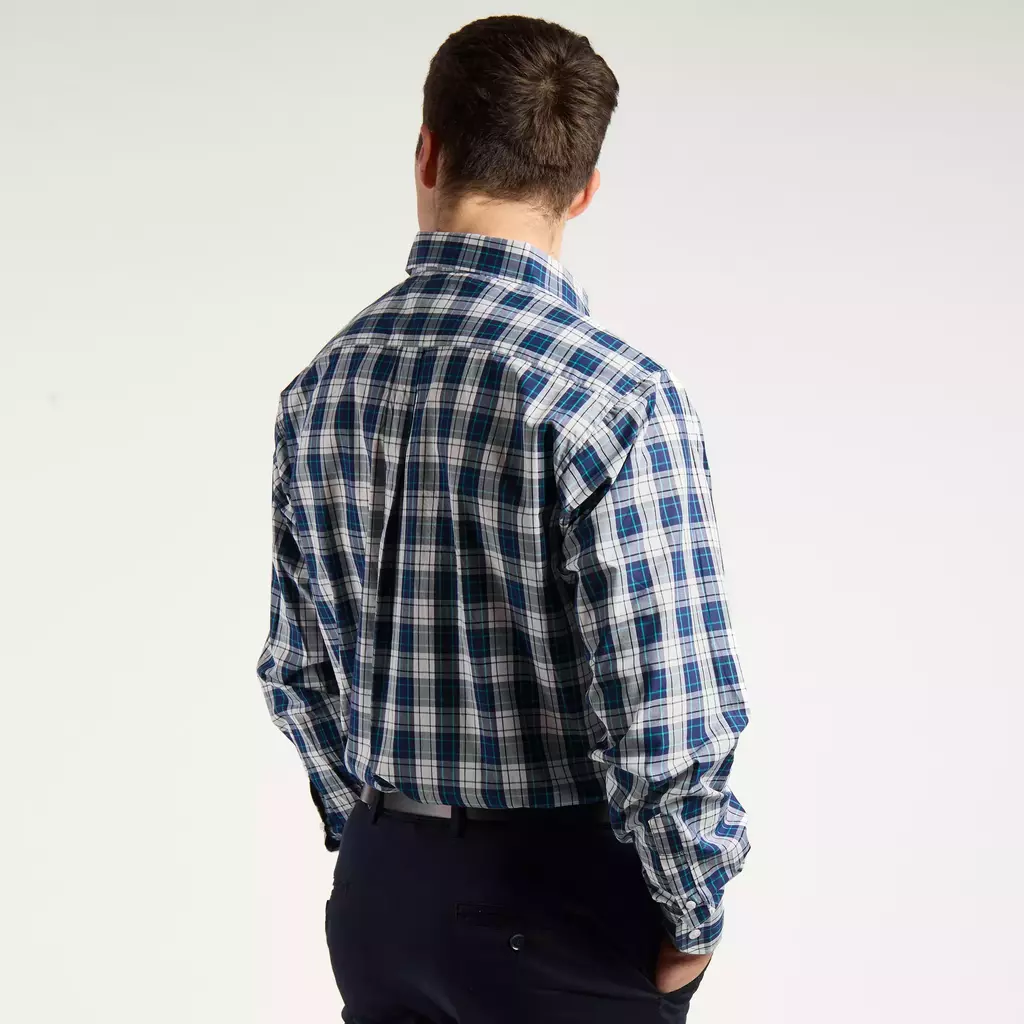 Camisa escocesa, manga larga realizada en poplín, un tejido de algodón de excelente calidad, que se caracteriza por su mayor cantidad de hilos, resultando una tela suave y al mismo tiempo estable.
