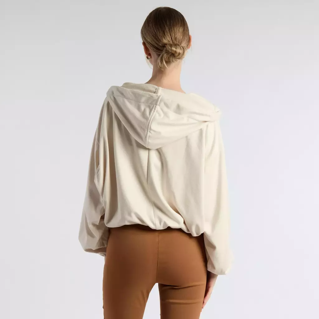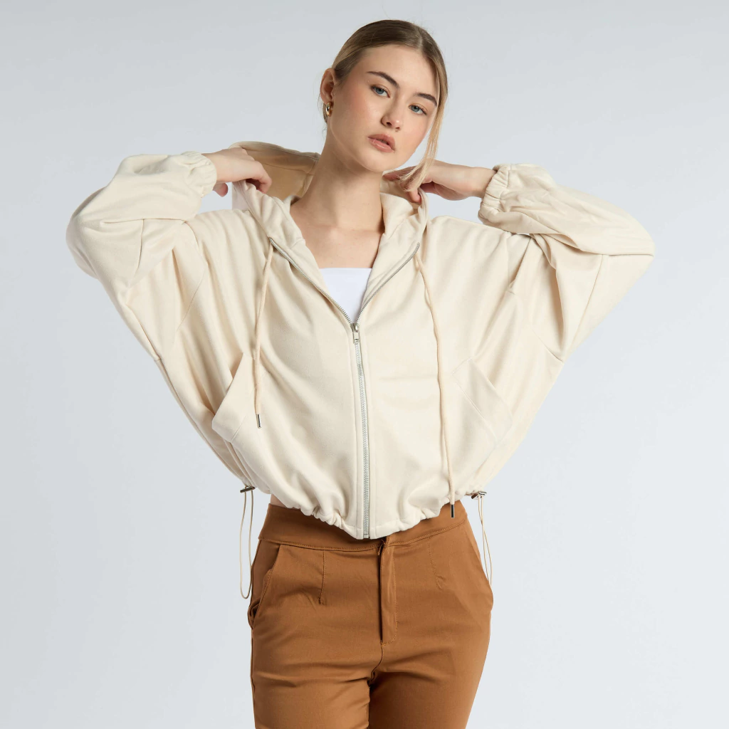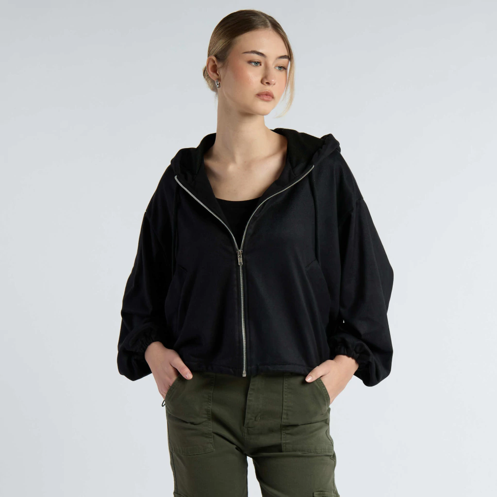Posee capucha, elástico en el ruedo y puños para mayor ajuste.