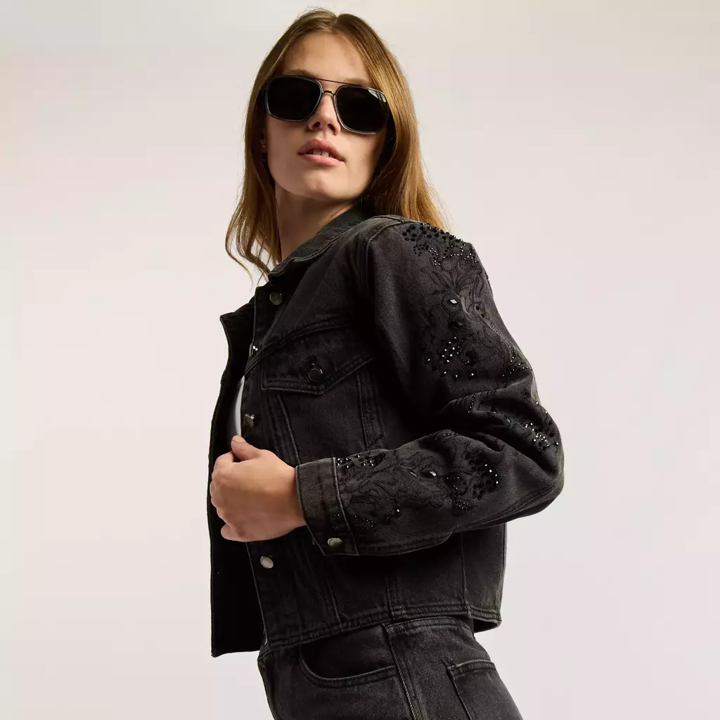 Diseño de flores bordadas y strass acompañando en las mangas.