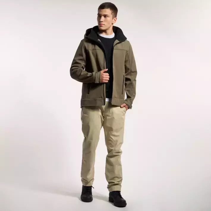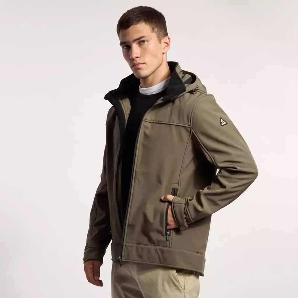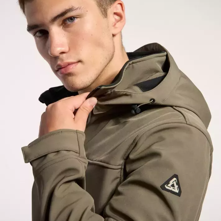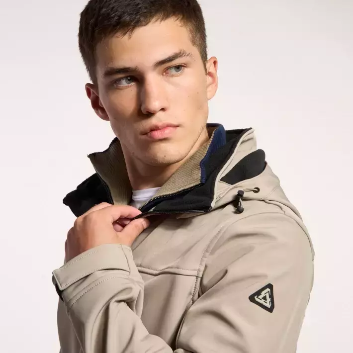 ampera realizada en microfibra softshell tricapa con membrana, resistente al viento, repelente al agua, de secado rápido y altamente transpirable.