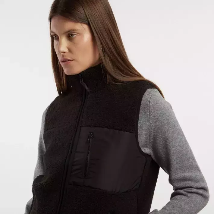 Chaleco de corderito de dos colores con cuello alto y cierre frontal.