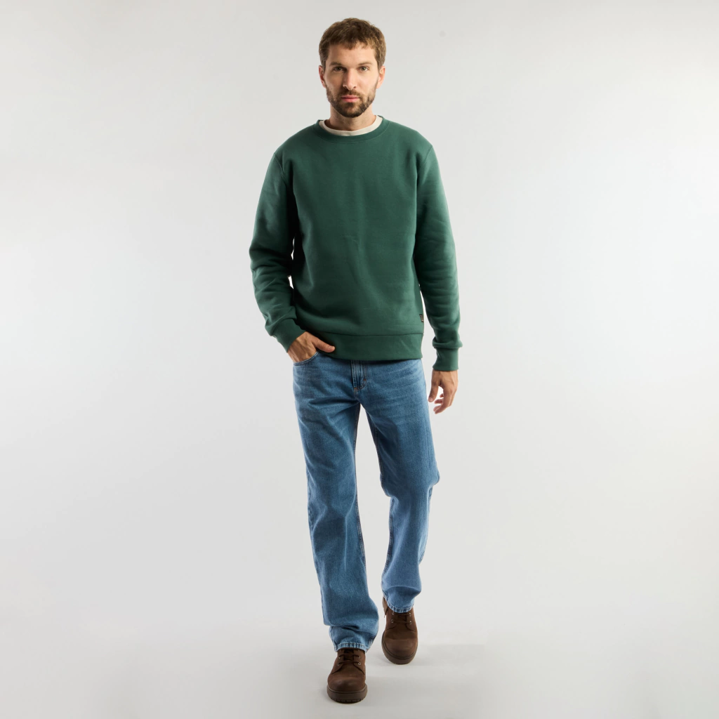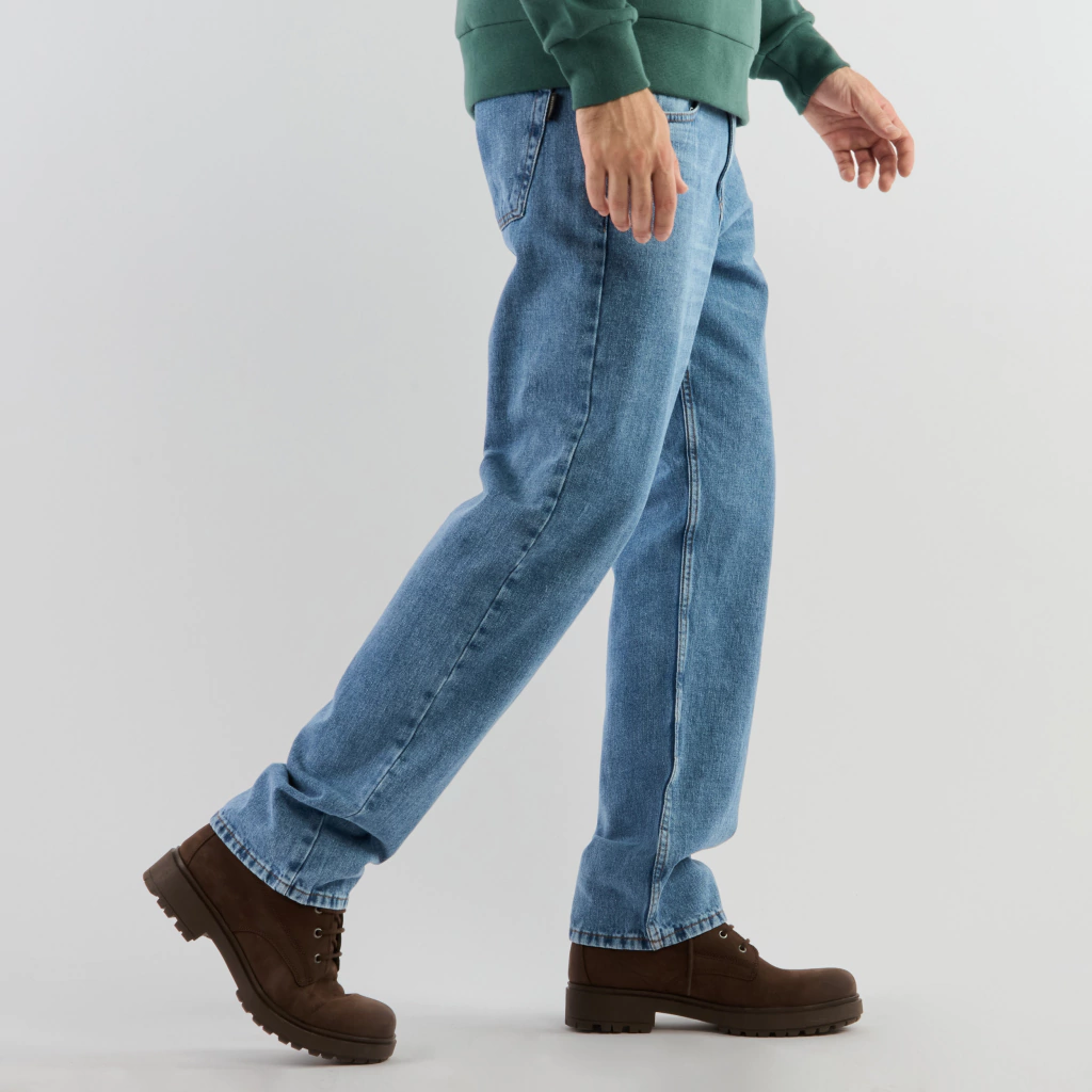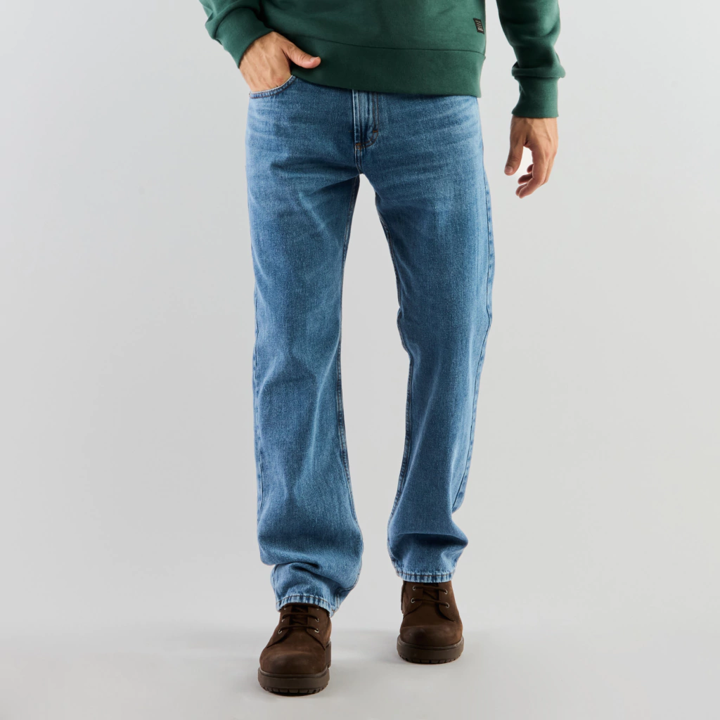 Jean cinco bolsillos de calce clásico, tiro medio con efecto lavado. Posee cartera con botón metálico y cierre. Detalle de costura ocre a contra tono.