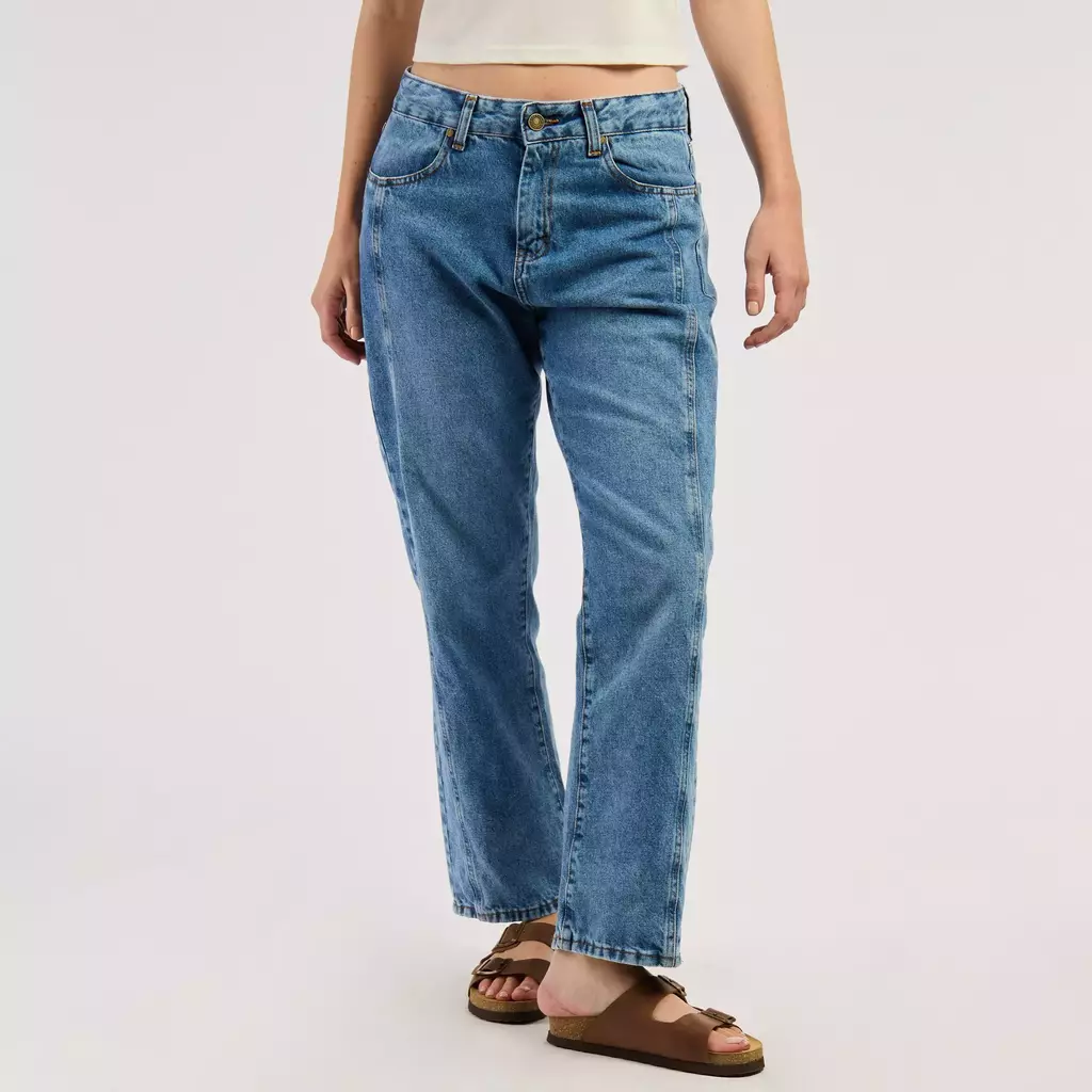 Jean tiro alto confeccionado en denim de algodón, lavado celeste. Diseño de recorte en la pierna que crea un diferencial.