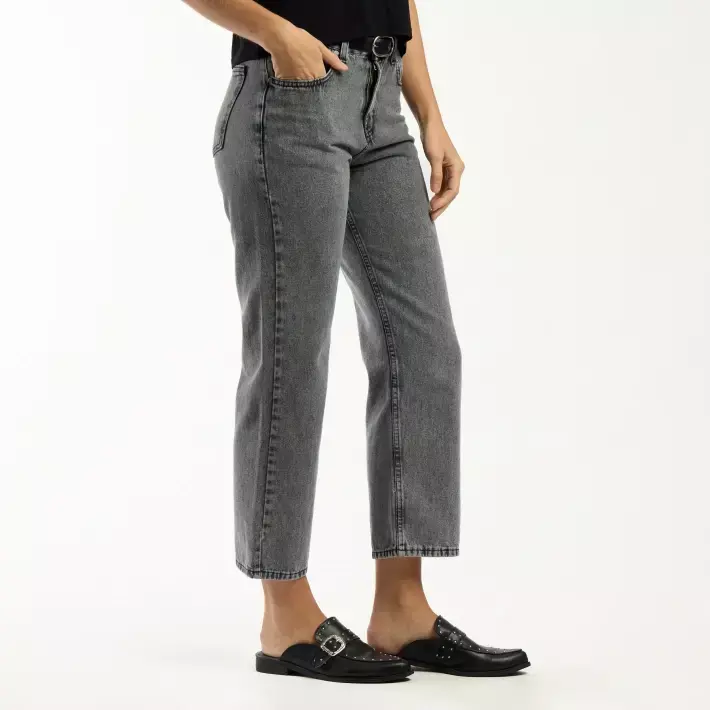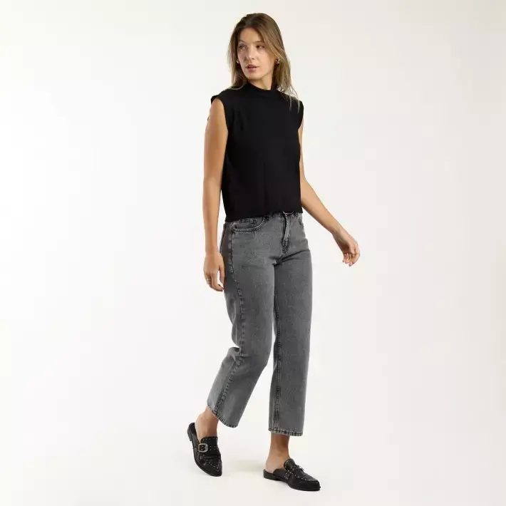 Pantalón tiro medio con largo bootcut confeccionado en denim rigido 100% algodón, tono negro.