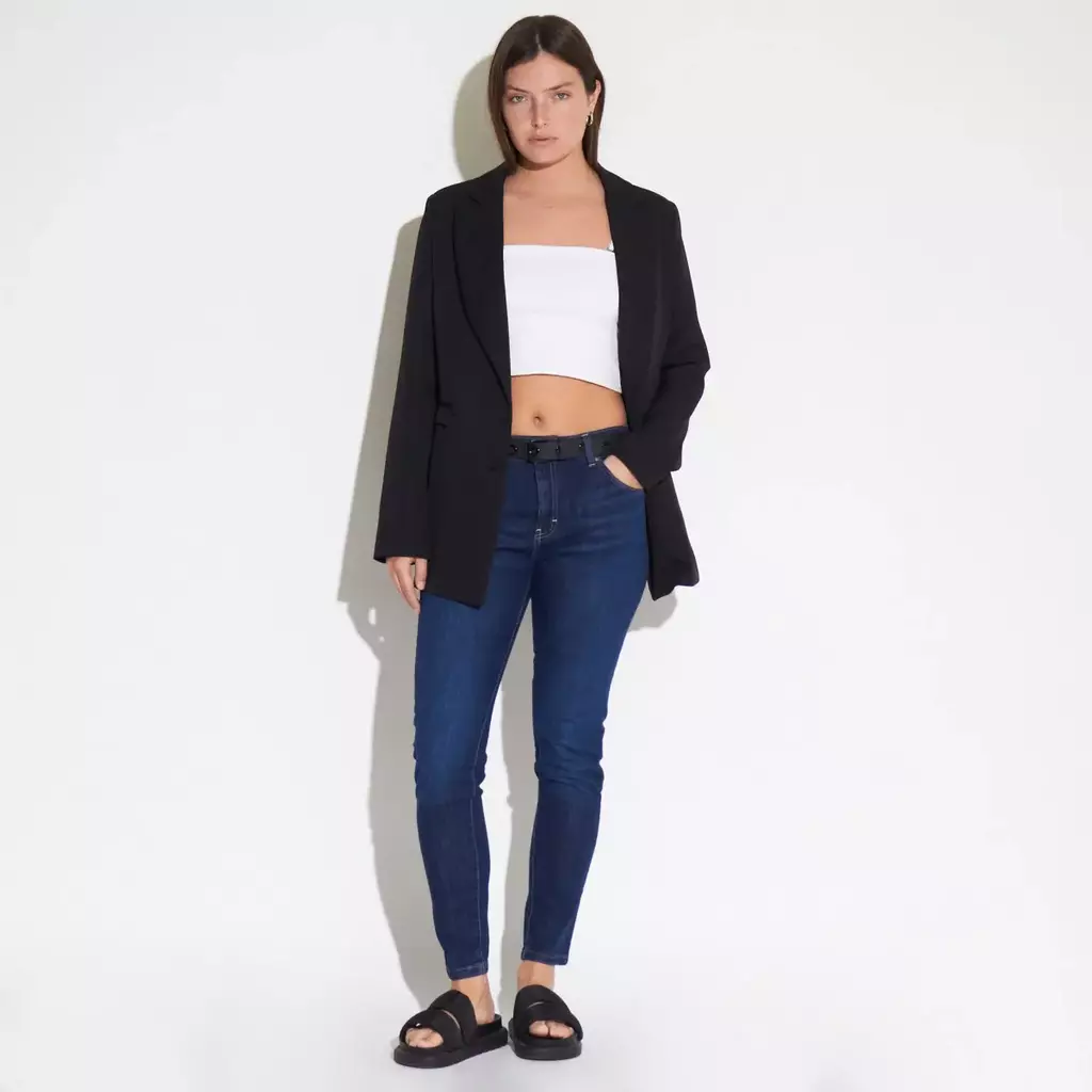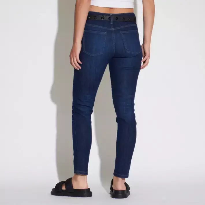 Jean slim fit, tiro medio confeccionado en denim de algodón con elastano en tono azul oscuro. Diseño de cinco bolsillos con avíos metálicos e hilo color beige claro. El calce infaltable en un lavado que nunca pasa de moda.