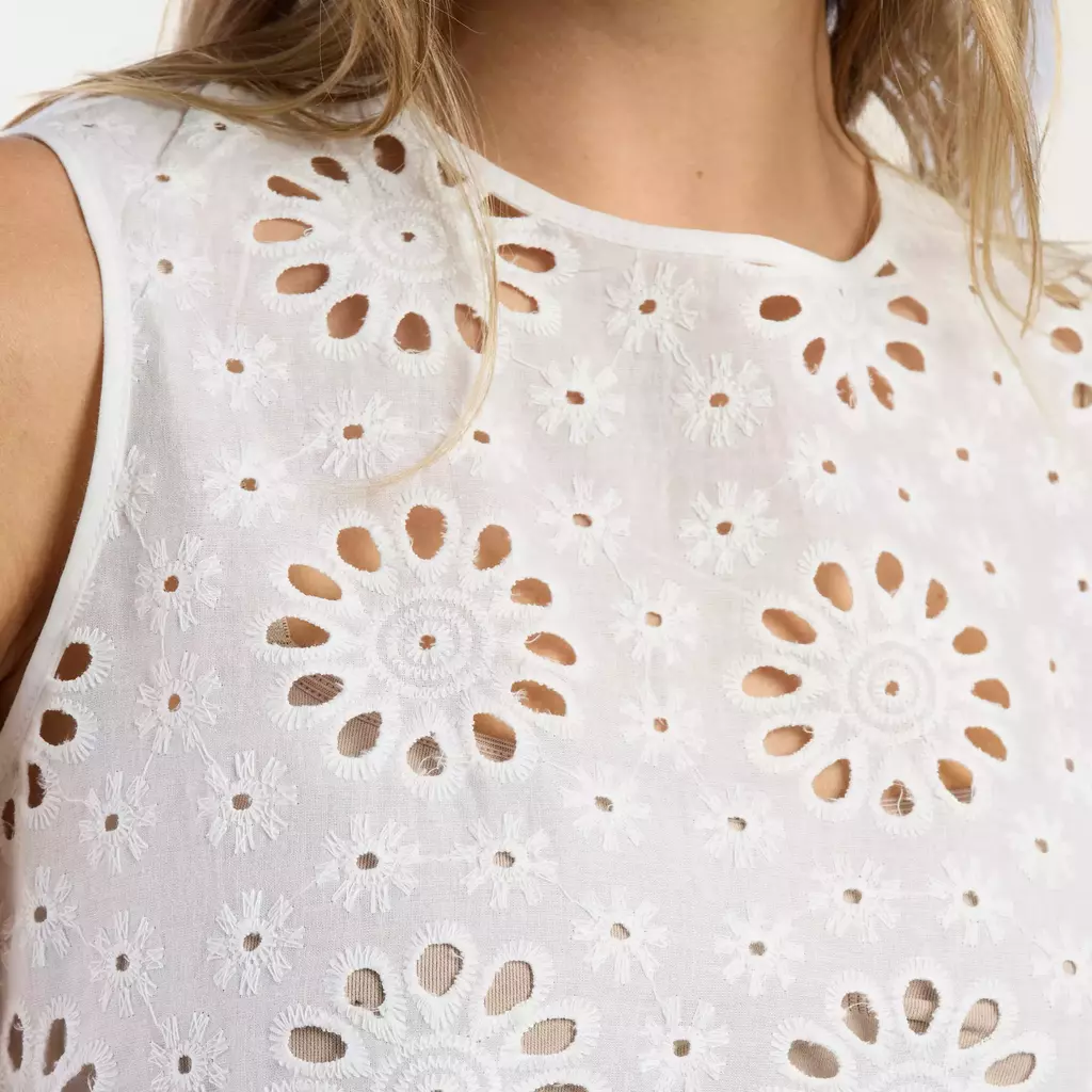 Musculosa de algodón sin mangas de broderie calado. Posee ruedo ondulado siguiendo el diseño de la tela.